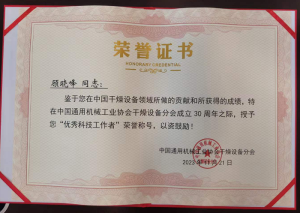 2023年11月21日,鑒於我司在中國幹燥設備行業做出的巨大貢獻、起到的引領示範作用,特在中國通用機械工業協會幹燥設備分會成立30周年之際,授予“優秀企業”榮譽稱號,授予總經理陸文光先生“優秀企業家”稱號,以及技術副總顧曉峰同誌優秀科技工作者”榮譽稱號,以資鼓勵!